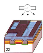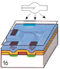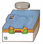 | Рентгенорезист подготавливает микросхему к наложению следующей, последней маски, с помощью которой наносится карта расположения алюминиевых проводников. | При облучении через маску рентгенорезист над алюминиевыми дорожками затвердевает; по этим дорожкам к транзистору (и от него) подводится ток. |