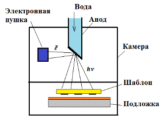 На рисунке 10 показана схема рентгеновской установки экспонирования. Электронная пушка генерирует электронный пучок, фокусируемый на охлаждаемой водой мишени (часто используется палладиевая мишень). Напряжение на аноде составляет 25 кВ, потребляемая мощность 4-6 кВт. В результате анод испускает рентгеновские лучи с длиной волны 0.437 нм, которые через бериллиевое окно попадают в камеру экспонирования. [5]