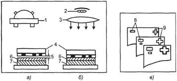 Рисунок 4 – Схема операции совмещения (а) и экспонирования (б), фигуры совмещения (в): 1 – микроскоп; 2 – источник света; 3 – объектив; 4 – фотошаблон; 5 – зазор; 6 – фоторезист; 7 – экспонируемая пластина; 8 – фигуры совмещения на пластине; 9 – фигуры совмещения на фотошаблоне