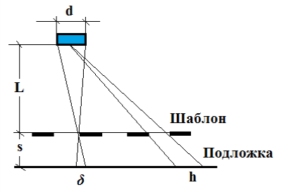 Описанная выше схема не позволяет достичь максимально возможного разрешения ввиду геометрических ограничений (рис. 11). Рассмотрим ситуацию, когда источник рентгеновских лучей диаметром d расположен на расстоянии L от рентгеновского шаблона, который в свою очередь отстоит на расстояние s от покрытой резистом пластины. Протяженность источника приводит к размытию края изображения на резисте на величину δ = d (s/L). Для типичных величин d = З мм, s = 40 мкм и L= 50 см размытие изображения составляет величину порядка 0,2 мкм. [5]