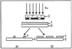 Рисунок 3 – Схема воспроизведения изображения методом проекционной фотолитографии: а – с негативным фоторезистом; б – с позитивным фоторезистом; 1 –фоторезист; 2 – подложка; 3 – фотошаблон