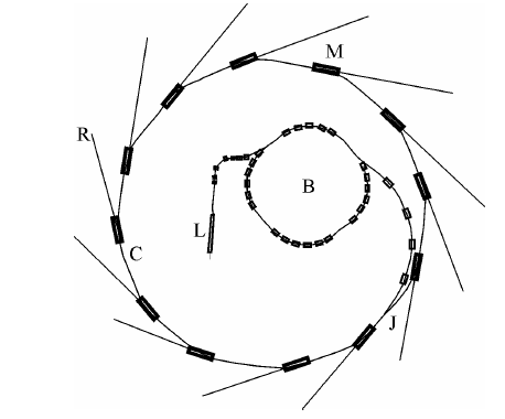 Рисунок 7 – Схема источника синхротронного излучения: L–линейный ускоритель; B–бустерный синхротрон; C накопительное кольцо; М-поворотные магниты; R – каналы синхротронного излучения; J – место соединения бустерного синхротрона с накопительным кольцом