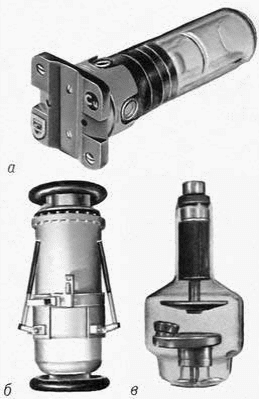 Конструкция рентгеновских трубок может быть разной в зависимости от условий применения и предъявляемых требований. Рентгеновские трубки применяют в рентгеновском структурном анализе (Рис.9,а), рентгеновском спектральном анализе, дефектоскопии (Рис.9,б) рентгеодиагностике (Рис.9,в), рентгенотерапии, рентгеновской микроскопии и микрорентгенографии. Наибольшее применение во всех областях находят отпаянные рентгеновские трубки с термоэмиссионным катодом, водоохлаждаемым анодом, электростатической системой фокусировки электронов. [8]