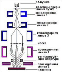 В системе с уменьшением изображения в качестве маски используется свободно подвешенная перфорированная металлическая фольга. Поток электронов, сфокусированный специальной электронооптической системой, проходит через маску и формирует на пластине ее четкое изображение меньших размеров. При десятикратном уменьшении маски могут быть сформированы поля диаметром 3 мм и получена ширина линий до 0,25 мкм. Схема установки приведена на рисунке 5.