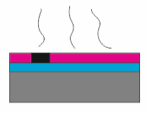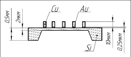 На рисунке 13 показана кремниевая подложка толщиной 0,5мм со слоем мембраны толщиной 2 мкм, на которой нанесен слой из материала, поглощающего рентгеновское излучение, из золота толщиной 0,25 мкм. Затем нанесли вспомогательный упрочняющий пленочный слой меди электролитическим осаждением толщиной 10 мкм. В результате чего получили рентгеношаблон.
