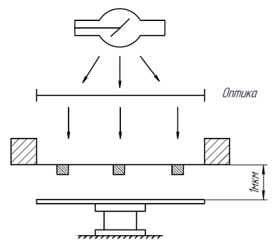 На рисунке 26 показаны рентгеновские лучи, которые проходят через оптику и попадают на рентгеношаблон. Потом попадают на подложку. Для того, чтобы просветить подложку требуется подвести ее с помощью магнитореологического привода на 1 мкм к рентгеновскому шаблону. Следовательно, магнитореологический привод используется для подведения с максимальной точностью к подложке.