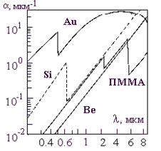 Рисунок 12 – Спектры поглощения Au, Si, Be, резиста ПММА.