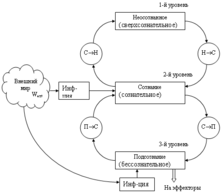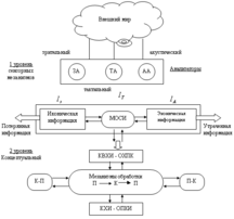 Зрелость 27. Метод концептуальных информационных портретов. Атрибутивная модель. Для описания и анализа задачных технологий творческой деятельности удобно пользоваться методом графической интерпретации информационных представлений творческой задачи. С этой целью рассмотрим метод представления ментальных информационных портретов в графической форме, который совпадает с их концептуальной формой представления. Формальным представлением такого представления является атрибутивные модели. Любой объект, предмет или явление характеризуется наборами свойств или атрибутов, определенной степенью релевантности и уровнем адекватности. Можно реальные или мысленно представленные объекты оригиналы замещать определенной совокупностью атрибутов этого объекта Ao, который включает некоторый набор атрибутов Ai : i = 1,…, n . Ao - определенное свойство оригинала, такое свойство оригинала, может приобретать качественное или количественное значение. AI = (i1, … ,ij, …, imi). ij – значения могут составлять ряды в зависимости от дисциплины. Выделим некоторую геометрическую область и разобьем ее на подобласти, и в рамках подобласти определим возможные значения. Совокупность значений образуют поле атрибутов, а совокупность полей атрибутов в свою очередь образуют область, определяющую на атрибутивном уровне тот или иной объект, процесс. Дисциплины упорядочивания атрибутов и их значений, прежде всего, определяется конкретным объектом, а также решаемыми задачами. Бывает линейное упорядочивание, нелинейное упорядочивание (гнездо) и смешанное (линейно-гнездовое). 28. Уровни представления концепт. информац. портретов. Определим, что концептуальный информационный портрет отличается от физического уровня представления информационных портретов тем, что каждый элемент информационного поля - образ первичного концепта (понятия). При таком подходе совокупность элементарных полей концептуального уровня представления образует тезаурус информационного поля, который выражен через первичные концепты. В зависимости от полноты и целостности описания предметов, объектов или предметной области существования объектов, через соответствующий тезаурус, можно говорить об информационном представлении соответствующих предметов, объектов или предметных областей в форме концептуальных информационных полей. С точки зрения полноты и целостности такого представления можно выделить 4 уровня, каждый из которых представляет информационный портрет (ИП) соответствующего оригинала или предмета объекта, формируемого на ментальном уровне. Исходя из теоретических и практических потребностей целесообразно выделить 4 уровня: 1) Идеальный ИП; 2) Персональный ИП; 3) Коллективный ИП; 4) Глобальный ИП. Идеальный информационный портрет - это абсолютная трансформация объекта-оригинала в его информационную форму представления на основе тех или иных методов отображения, в частности - атрибутивных. Персональный информационный портрет - атрибутивное (концептуальное) представление реального (виртуального) объекта или предмета, которое осуществляется на основе знаний эксперта. Коллективный информационный портрет формируется из совокупности персональных, т.к. восприятие отражения одного и того же объекта или предмета субъективно и не совпадает с любым другим, то и соответственн