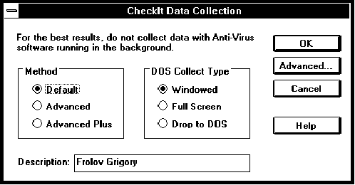 Следующий переключатель, расположенный в диалоговой панели "Checkit Data Collection", называется "DOS Collect Type". Этот переключатель служит для управления процедурами проверки, предназначенными для запуска в среде операционной системы MS-DOS.