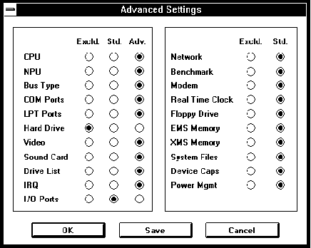 Если компьютер зависает при использовании вами режимов "Advanced" и "Advanced Plus", вы можете использовать более простые способы проверки отдельных компонент компьютера. Нажмите в диалоговой панели "Checkit Data Collection" кнопку "Advanced..." . Откроется диалоговая панель "Advanced Settings" (см. рис. 5.21). Эта диалоговая панель содержит трехпозиционный переключатель для каждой подсистемы компьютера.