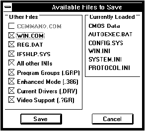 Выберите из меню "DOS/Win" строку "Rescue Disk". На экране появится диалоговая панель "Available Files to Save" (см. рис. 5.22). В группе "Currently Loaded" находится список файлов, которые обязательно будут сохранены. Среди них основные файлы конфигурации MS-DOS и Windows, а также содержимое CMOS-памяти.
