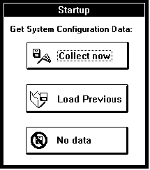 Сразу после запуска приложения WINCheckit на экране появляется диалоговая панель "Startup" (см. рис. 5.19). В этой диалоговой панели расположены три кнопки: "Collect now", "Load Previous" и "No data". Чтобы выполнить процедуру проверки компьютера и собрать информацию об его подсистемах, нажмите кнопку "Collect now". Если вы желаете загрузить старые данные или вообще не желаете проверять конфигурацию компьютера, нажмите кнопку "Load Previous" или "No data" соответственно.