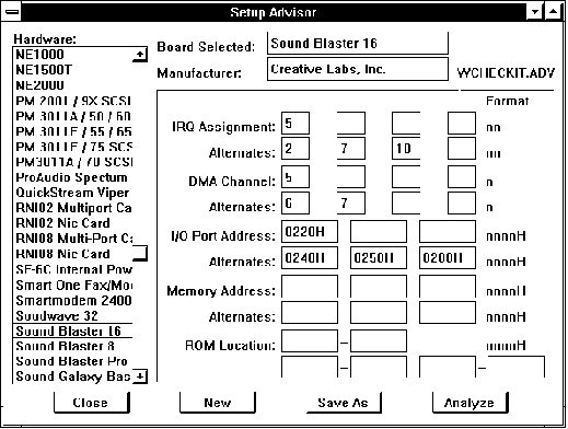 В левой стороне диалоговой панели "Setup Advisor" отображается список различных плат расширения. Выберите из него название устройства, которое вы собираетесь подключить к компьютеру. Например, выберите Sound Blaster 16. Полное название устройства и название фирмы-изготовителя появится в поле "Board Selected" и "Manufacturer".