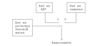 Для определения того, какие точки должны быть изменены, а какие - сохранены, используется №2регистр битовой маски№0. Бит регистра битовой маски определяет, будет ли записана в соответствующий бит видеопамяти информация из АЛУ или регистра-защелки: