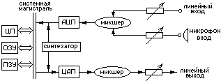 Внешние аналоговые звуковые сигналы через линейные входы поступают на аналоговое суммирующие устройства – микшер. Микшер так же обеспечивает возможность изменять уровень входных сигналов и обеспечивать предварительную тоновую обработку (усиление или ослабление) колебаний высокой или низкой частоты – обертонов, введение дополнительных звуковых сигналов). Далее входной сигнал поступает на АЦП и в цифровом виде может быть записан на диски. Выходные цифровые сигналы преобразуются в аналоговую форму с помощью ЦАП и через выходной микшер поступают на линейный выход. Все эти элементы: усилители, микшеры, синтезаторы расположены на звуковой карте. Синтезатор предназначен для имитации звуков от стандартных источников (музыкальных инструментов, внешних стандартных источников), а так же для воспроизведение стереофонических записей объёмного звучания. Важными элементами устройство являются: АЦП и ЦАП.