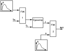 ГУК 1 формирует на своём выходе сигналы обертонов, имеющих частоту fm и огибающую mi. Таких ГУК-ов может быть достаточно много для формирования полноты звуков. Выходы генераторов обертонов смешиваются на сумматоре и на них накладываются колебания основного тона fc. Выходной сигнал f формируется ГУК 2 с учётом заданной амплитуды сигнала А.