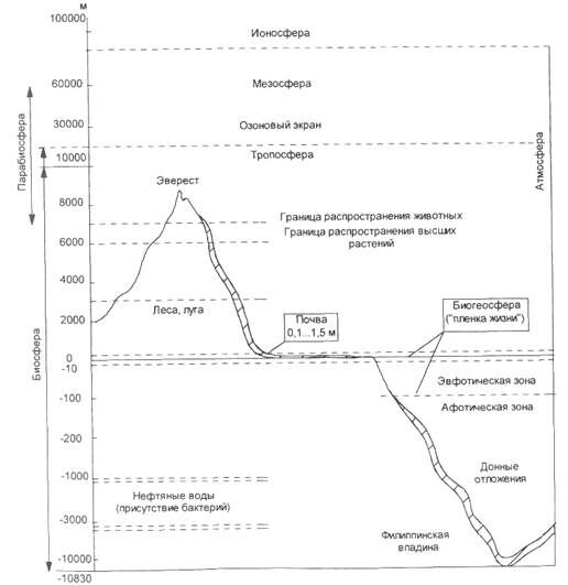 Границы биосферы совпадают с границами распространения живых организмов в оболочках Земли, что определяется наличием условий существования жизни (благоприятный температурный режим, уровень радиации, достаточное количество воды, минеральных веществ, кислорода, углекислого газа). Биосфера охватывает всю поверхность суши, а также океаны, моря и ту часть недр Земли, где находятся породы, созданные в процессе жизнедеятельности живых организмов. Иначе говоря, биосфера - это часть литосферы, атмосферы, гидросферы, заселенная живым веществом.