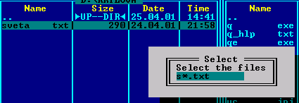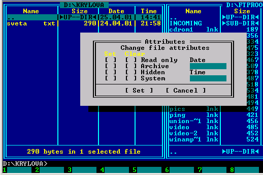 После нажатия “enter” NC выделяет все файлы подходящие под эту маску. В данном случае это файл sveta.txt. Потом F9 F A и появляется новое окно. В этом окне можно установить атрибуты, которые будут распростроняться на все файлы начинающиеся на “s” и с расширением txt ( в данном случае – sveta.txt).
