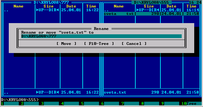 Для того чтобы переслать этот файл из каталога 555 в каталог 777, надо нажать F6 (для этого опять же, надо чтобы на одной панели был открытый каталог 555, а на другой 777).
