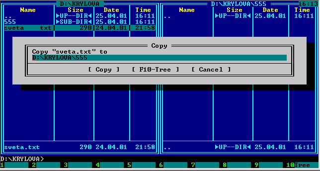 Для того чтобы скопировать файл sveta.txt в уже созданный каталог 555, нажимаю F5 и появляется окно в котором уже написан путь. Для этого надо чтобы файл находился на одной панели, а открытый каталог 555 на другой панели.