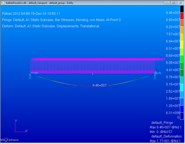 Вывод: Результатом расчета в пакете Nastran/Patran является файл F06, а также графический результат представлений в интерфейсе программы Patran. На изображении видно, что наибольшие напряжения действуют в центральном сечении балки. А также наибольшее перемещение совершает центральное сечение. Более подробные результаты можно найти в файле F06 для каждого сечения.Решив одну и ту же задачу , построив ее разными методами в программе Patran, получили один и тот же результат максимальных напряжений