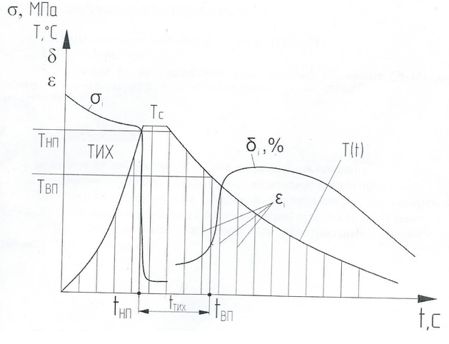 Рис.2. Схема выявления верхней TВП и нижней TНП границ ТИХ в металле ЗТВ по заданным термическим циклам сварки T(t) по характеру изменения σ(t) и δ(t); εi – мгновенное растяжение образца при различных температурах; TНП, tНП – температура и время наступления нулевой прочности в сплаве при хрупком разрушении; TВП, tВП – температура и время восстановления пластичности при охлаждении; TC и TВП – температуры равновесного и неравновесного солидусов соответственно.