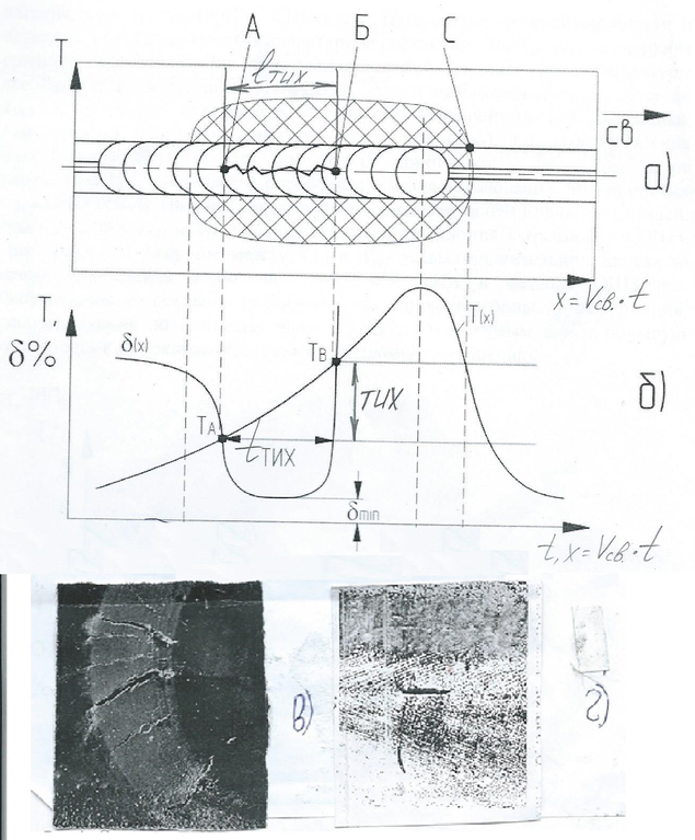 Рис.1. Схема определения границ температурного интервала хрупкости в металле шва а), б) и виды шва с горячими трещинами в), г).