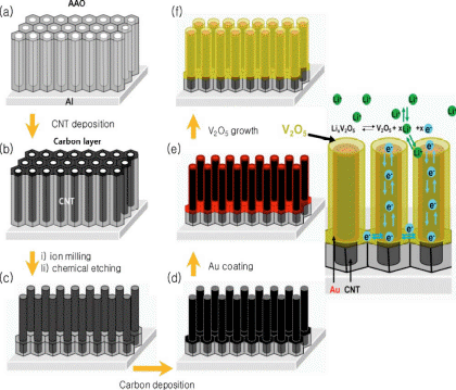 Вертикально расположенные стержни состоят из Au/CNT ядра и V2O5 оболочки. Высокоорганизованные поры были изготовлены путем двухступенчатого анодирования, при котором электрополированная алюминиевая фольга была подвержена анодной обработке в 0,3М растворе щавелевой кислоты при 287К при постоянном напряжении 40В. CVD (химическое осаждение из газовой фазы) было использовано для создания роста углеродных нанотрубок (CNT) путем пиролиза ацетилена при 873К в порах анодного оксида алюминия. СNT матрица подвергалась ионному травлению для удаления с поверхности углерода и затем химически травился анодный оксид алюминия, после чего на поверхности анодного оксида алюминия снова осаждался слой углерода с использованием метода для выращивания CNT. Au и V2O5 осаждали путем распыления над вертикально расположенным шестиугольным рисунком CNT для создания матрицы. Гексагональный рисунок матрицы расположен вертикально и физически изолирован, но электрически соединен через электрод со слоем углерода и золотым покрытием, которое способно быстро переносить заряд. Плотность, диаметр и высота столбиков контролируются управлением матрицей из анодированного оксида алюминия и процессом травления.