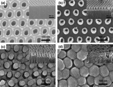 Рисунок 2 – Изображения сканирующей электронной микроскопии: a) Пористый наношаблон из анодированного оксида алюминия с матрицей гексагональных пор; b) Выровненная по вертикали CNT матрица; c) Матрица из углеродных нанотрубок, покрытых золотом; d) Вертикально выровненная матрица наностолбиков с оболочками из V2O5)