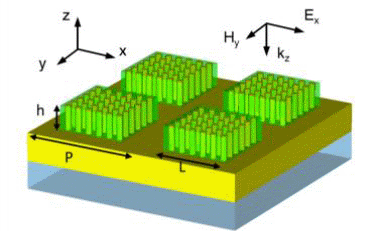 Периодические полости в метаматериале из нанопроводов с периодом P=600нм заземленным золотой пленкой толщиной 150нм на стеклянной подложке. В каждой полости располагаются 6*6 столбиков из золотой проволоки с радиусом r0 и расстоянием между центрами D=60нм, строенные в глиноземного хозяина кубической формы с длиной стороны L=360нм и высотой h=130нм. Конечно-элементный способ моделирования выполняется для получения спектра отображения.