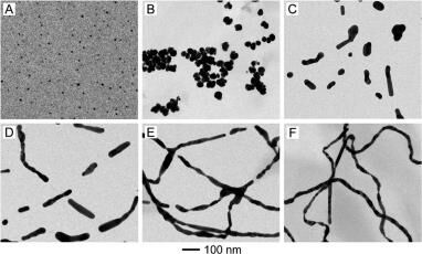 Чтобы расшифровать механизм, ответственный за образование волнистых нанопроволок, собрали образцы за разное время для просвечивающей электронной микроскопии (Рис. 3). На начальной стадии в растворе были найдены только сферические частицы с диаметром 10нм (рис.3А), указывающие на превращение AuI в Au и последующее образование наночастиц. После того, как реакция продолжалась в течение 15 мин, в растворе были обнаружены наночастицы с большим диаметром (рис. 3В), равным 35нм, которые формируются путем роста маленьких наночастиц и их слияния с целью уменьшения поверхностной энергии. Затем, когда время реакции достигает 25-35мин, большие частицы объединяются в короткие дорожки и похожие на ожерелье наноструктуры (рис. 3С, D). Интересно, что наностержни были более или менее выровнены вдоль длинной оси нанопроволоки (рис. 3D), предполагая возможное вовлечение эффекта шаблона, полученного с помощью CTAB молекул. Эти промежуточные структуры продолжают расти в длину (рис. 2Е), и коричневый, похожий на хлопок материал появляется на границе раздела воздух/вода протекания реакции в течение 55мин, на что указывает образование золотой волнистой нанопроволоки. Когда время реакции достигает 90мин, получается золотая волнистая нанопроволока с большим соотношением длины к диаметру. В этот момент, на Au нанопроводах можно увидеть большое число выпуклых/вогнутых областей и перегибов. Движимые разницей в химических потенциалах между выпуклыми и вогнутыми участками, атомы Au могут диффундировать вдоль единичной нанопроволоки для создания гладких поверхностей конечных нанопроводов. Тем не менее, перегибы еще остаются, делая провода «волнистыми» по внешнему виду.