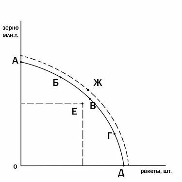 В данном случае точки А, Б, В, Г, Д — точки, принадлежащие КПВ. Точка E внутри графика КПВ означает неполное или нерациональное использование имеющихся ресурсов. Точка Ж (выше кривой) недостижима при данном количестве ресурсов и имеющейся технологии. Попасть в эту точку можно, если увеличить количество используемых ресурсов или улучшить технологию производства (например, сменить ручной труд на машинный). При движении по кривой возможен только один, лучший вариант движения, который дает максимальный результат при минимальных затратах. Кривая производственных возможностей показывает совокупность всех точек или решений, в пределах которых следует выбирать оптимальный вариант. Все остальные точки представляют собой упущенные возможности или альтернативные затраты.