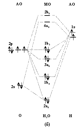 Электроны на связывающих 2а1 и 1b1 орбиталях обеспечивают связи О- Н, а на несвязывающих (3а1 и 1b2) орбиталях соответствуют свободным электронным парам в молекуле Н2О, как это описывается в рамках метода валентных связей.