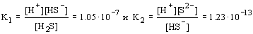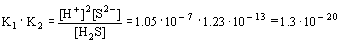 Отсюда следует, что [H+]2[S2- ] = 1.3. 10- 20. [H2S] = 1.3. 10- 21. Поскольку К2 меньше К1 на 6 порядков, то основной вклад в концентрацию [H+] в растворе H2S вносит К1. Таким образом, [H+]=[HS- ]=