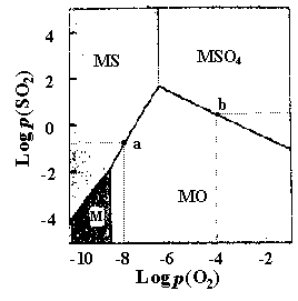 Используя диаграмму р(SO2) - p(О2) (рис.5), можно оценить состав продуктов окисления сульфидов M(II) в различных условиях. Например, при давлении p(О2) ~ 10-8 атм и р(SO2) ~ 2. 10-2 атм (точка а на рис.5) сульфид металла MS окисляется до оксида МО, а при p(О2) ~ 10-4 атм и р(SO2) ~ 1.7 атм (точка b на рис.5) - до сульфата MSO4.