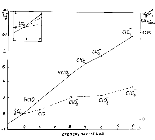 Диаграмма окислительных состояний (ОС) хлора (рис.6) представляет графическую зависимость вольт-эквивалента ВЭ = nEo, где Eо - стандартный потенциал (В), n - количество (в молях) электронов, пары частиц, например, HClOп 1/2Cl2 , от степени окисления. Величина nEo пропорциональна стандартной энергии Гиббса