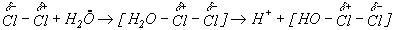 (Механизм реакции диспропорционирования включает поляризацию молекулы хлора молекулой H2O, образование промежуточного соединения и последующую его диссоциацию с образованием Cl--: