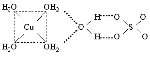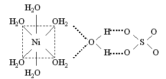 Например, пентагидрат сульфата меди(II) и гептагидрат сульфата никеля(II) содержат аквакомплексы – катион тетрааквамеди(II) и катион гексаакваникеля(II) и слабо связанную внешнесферную молекулу воды, которая объединяет катионы и анионы посредством водородных связей: