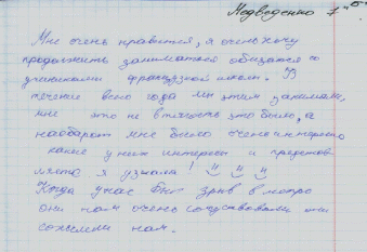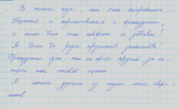 Благодаря переписке с российскими школьниками, мы смогли обменяться информацией о культуре, обычаях. Хотелось бы обмениваться большим количеством текстов, но, в общем, мне нравится переписываться по Интернету. Нужно будет выложить больше фотографий, чтобы иметь лучшее представление о том, о чем нам пишут.