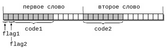Под описанную таким образом переменную отводится область памяти размером в слово. Если суммарный размер всех полей превысит размер слова, то отводится 2 соседних слова памяти, причем поле не может перекрывать границу между ними, и компилятор автоматически сдвигает поле, чтобы оно было выровнено по границе слова (в этом случае в первом слове остается безымянное пустое место). В приведенном примере при условии, что машинное слово занимает 16 битов, память распределится следующим образом: