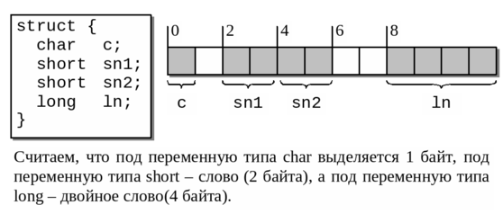 Рассмотрим подробнее размещение структуры в памяти генератором кода. Здесь возникают две проблемы – собственно размещение объекта типа «структура» в памяти и размещение элементов структуры в области памяти, выделенной под этот объект. Адрес, с которого размещается сама структура, называется базовым адресом, а адрес элемента структуры относительно ее базового адреса называется смещением. Заметим, что каждый тип данных транслируется в определенный машинный тип (например, “байт”, “слово”, “двойное слово”), которому соответствует некоторое правило выравнивания. Рассмотрим архитектуру с байтовой адресацией и правилами размещения, согласно которым слово располагается, начиная с байта с адресом, кратным 2, а двойное слово – начиная с байта с адресом, кратным 4. В различных реализациях языка применяются различные подходы к определению базового адреса структуры. Это может быть выравнивание по типу первого элемента структуры или по максимально длинному машинному типу и т.п. Смещения элементов структуры зависят от их типов, представления их типов на конкретной архитектуре и правил выравнивания, поэтому при трансляции структур могут оставаться «пропуски».