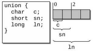 Объединение (union) – это тип данных, позволяющий хранить разнородные данные (поля) в одной и той же области памяти. Синтаксис объединений аналогичен синтаксису структур. Фактически, объединение – это структура, все поля которой имеют нулевое смещение относительно ее базового адреса, а размер выделенной области памяти позволяет разместиться в ней самому большому полю. При выравнивании учитывается требование для максимально длинного машинного типа, используемого для представления полей объединения, т.е. если одно поле можно разместить, начиная с адреса двойного слова, а второе – с адреса байта, то компилятор следует первому требованию.