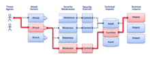 OWASP (see figure) depicts the same phenomenon in slightly different terms: a threat agent through an attack vector exploits a weakness (vulnerability) of the system and the related security controls causing a technical impact on an IT resource (asset) connected to a business impact.