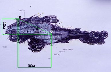 а представленном ниже рисунке изображен корабль и буквой P отмечена безвременно ушедшая башня. Из документации известно, что стандартная пушка, устанавливаемая на боевые корабли, весит 4 тонны. Навуходоносор весит 300 тонн. При настройке рулей корабля центр тяжести корабля устанавливается, как показано на рисунке – точка О. При оптимизации устойчивости корабельного орудия, было выставлено показанное на чертеже положение орудия (точка P – центр тяжести орудия). Найдите положение центра масс корабля после потери пушки.