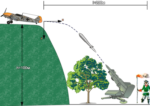 Задача. 1943 год. Советский солдат, затаившись в лесной чаще, находящейся в 200 метрах от 100-метрового холма, увидел, как вражеский фашистский самолет приземлился на верхушку холма. Под каким углом должен направить дуло пушки солдат, и с какой скоростью снаряд должен вылететь, чтобы в момент попадания ядра в самолет, оно летело горизонтально?