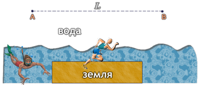 Задача. Пловец, многократно преодолевая дистанцию длиной L из А в В, обнаружил, что если выбираться на берег и пробегать часть пути по земле, то можно добраться из А в В быстрее, чем если плыть напрямую. Скорости движения пловца по воде и по земле равны V1 и V2 соответственно. Отрезок АВ параллелен берегу (см. рис.). На каком расстоянии от берега могут находиться точки А и В?