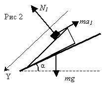 Перейдем в систему отсчета, связанную с клином. В ней на брусок кроме силы тяжести mg (m - масса бруска) и силы реакции клина N1 (см. рис. 2) действует сила инерции ma1, направленная параллельно плоскости в сторону, противоположную движению клина по ней.