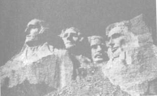 From left are the monumental carved heads of G. Washington, T.Jefferson, T. Roosevelt, A. Lincoln.