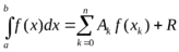 где хк – выбранные узлы интерполяции; Ak – коэффициенты, которые зависят от выбранных узлов, но не зависят от вида функции f(x); R – остаточный член, определяющий максимальную ошибку при использовании квадратурной формулы; k=0, 1, …, n.
