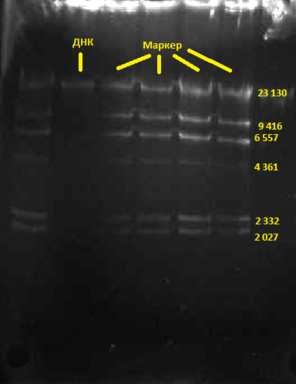 Бэнд ДНК и первый бэнд маркера, соответствующий длине 23 130, находятся на одном уровне, так как ДНК кольцевая релаксирована, что укорачивает ее.Релаксироанная ДНК продвигается быстрее в геле, чем линейная того же веса. Но ДНК в эксперименте имеет больше пар оснований, чем линейная у маркера, что компенсирует скорость прохождения, поэтому бэнды на одном уровне.